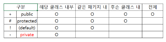 -default : 동일 패키지에서만 접근 허용 (작성하지 않는 것이 default)