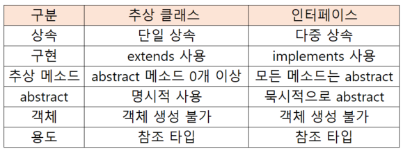 - 추상클래스는 생성자도 가질 수 있다. 하지만 직접적으로 인스턴스를 생성할 수 없다.