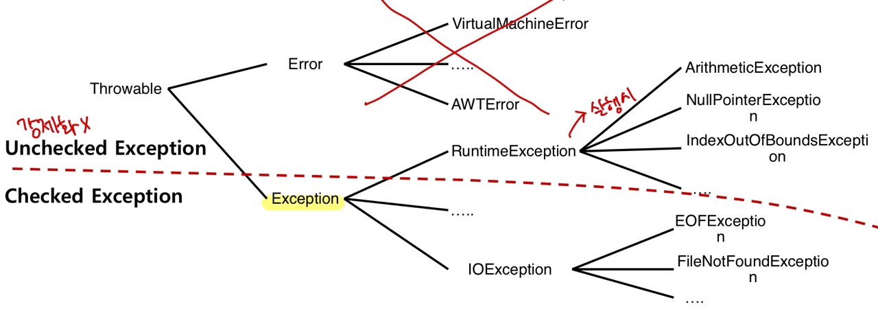 - 예외 클래스들의 최상위 클래스는 Exception 클래스이며 예외처리를 해야하는 Checked Exception과 해주지 않아도 되는 Unchecked Exception으로 나뉜다.