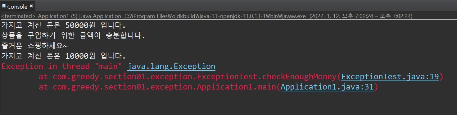 - 예외 발생 구문 이하 구문은 동작하지 않고 되돌아온다. (상품가격 50000, 가진 돈 10000 코드 이하구문)