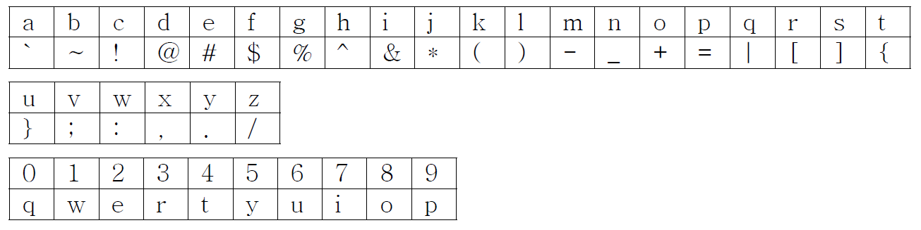 5-10. 다음은 알파벳과 숫자를 아래에 주어진 암호표로 암호화하는 프로그램이다. (1)에 알맞은 코드를 넣어서 완성하시오.