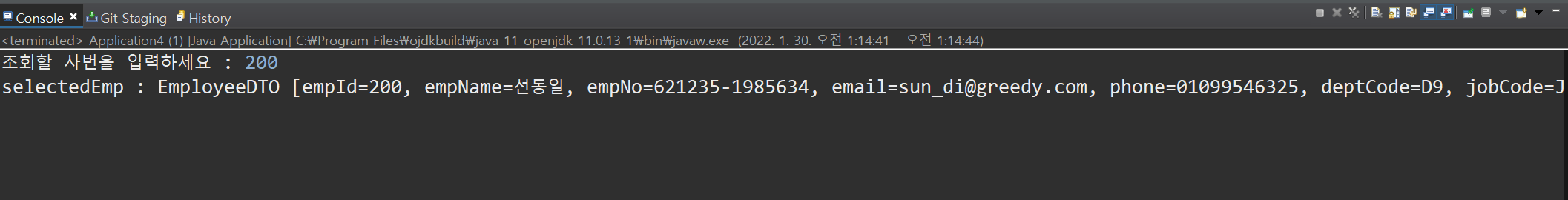 DTO클래스 작성 후 EmployeeDTO에서 조회할 값을 Scanner로 입력해서 출력한다.
