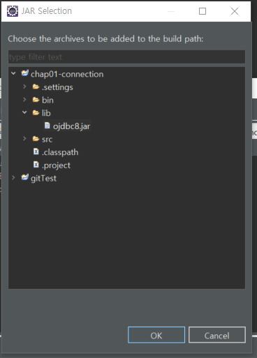JAR Selection에서 lib-ojdbc8.jar 선택 후 OK클릭