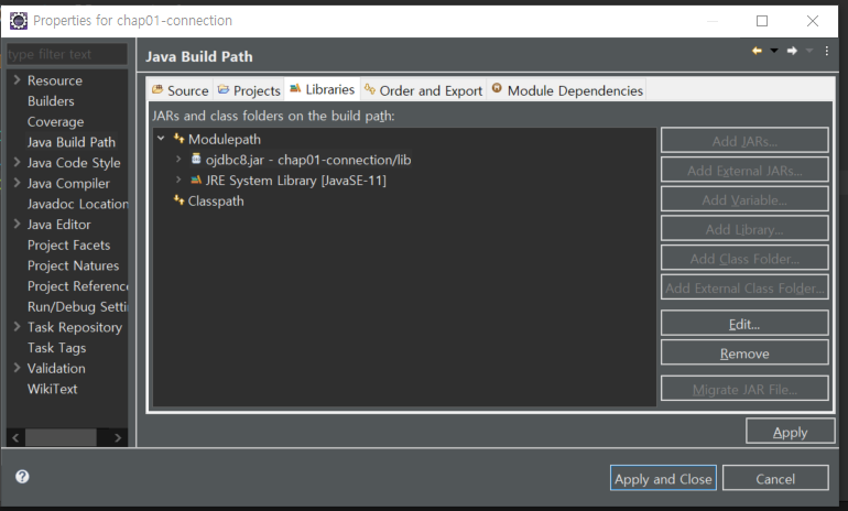 Buil Path 경로에 ojdbc8이 추가된것 확인하고 Apply and Close 클릭