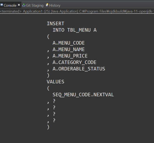 앞서 만들어놨던 employee-query를 복사해서 menu-query로 수정하고 메뉴를 insert할 key값 설정 후 안에 쿼리문을 작성해 줬다. 넣어야 할 값들이 values이기 때문에 ?(물음표)로 작성해준다.