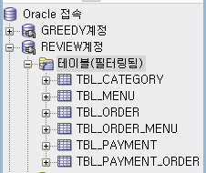 오라클에서 새로운 계정, 접속계정 따로 만들어줘서 수업 때 받은 쿼리문 수행해준 후에 생긴 테이블들.