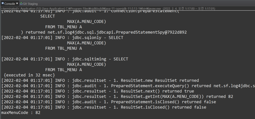 실행 클래스에서 selectLastMenuCode메소드 불러와 출력함