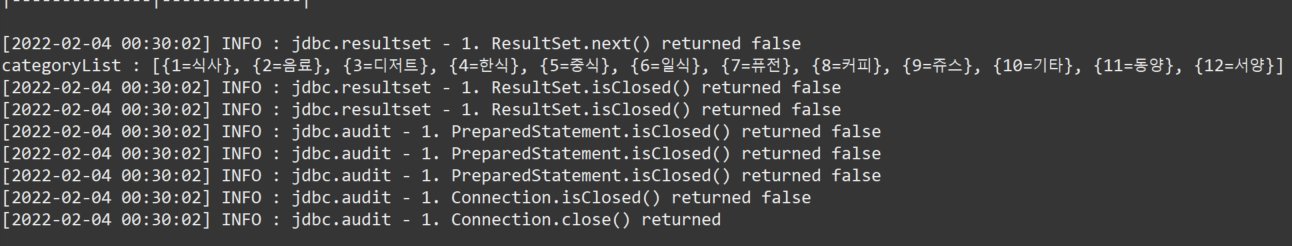2. selectAllCategoryList조회 (try-cath 바깥 구문에서 List변수 선언)
