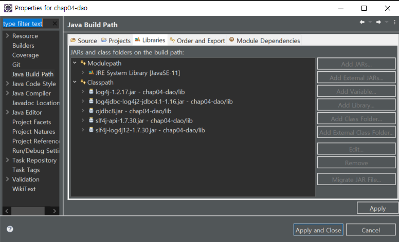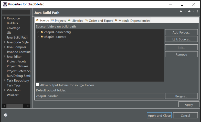 buil path에서 Jar들 추가해준 후, source탭에서 config폴더 선택 후 적용까지 한 상태.
