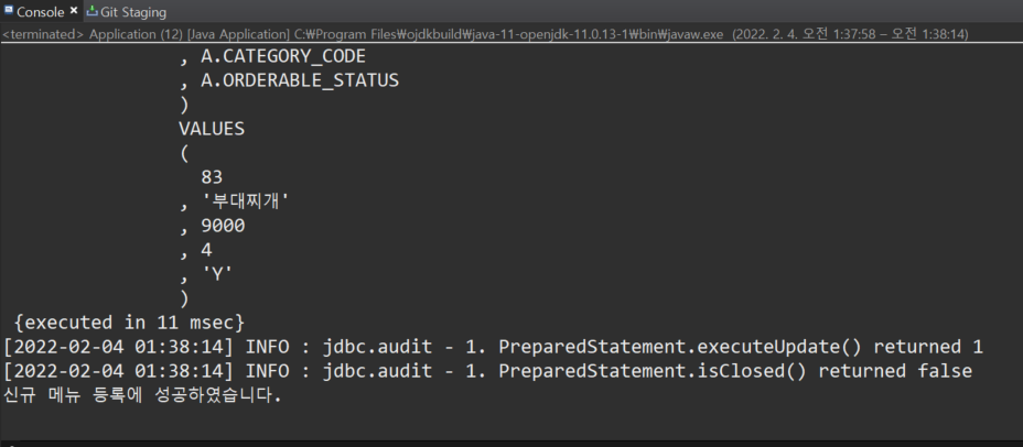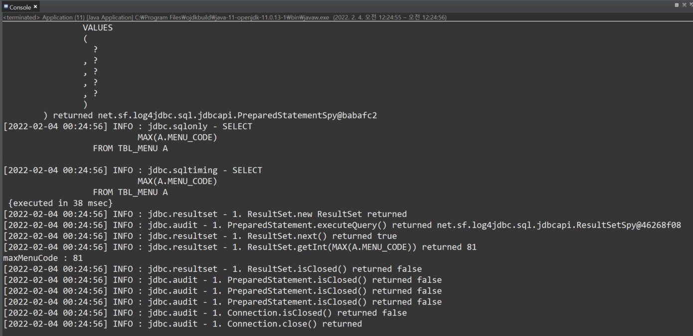 실행 클래스에서 selectLastMenuCode메소드 불러와 출력함