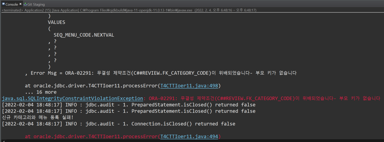 오류가 나는 콘솔창이 뜨고, 오라클에서 확인해보면 두 개의 값 모두 insert되지 않았다.