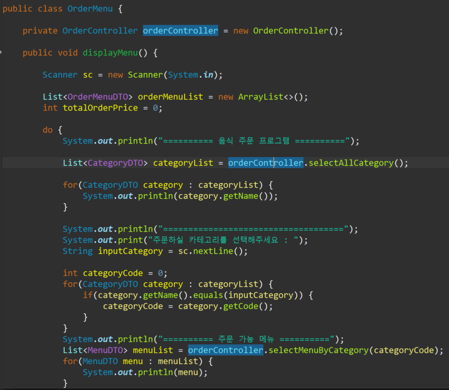 List<MenuDTO> menuList = orderController.selectMenuByCategory(categoryCode);
