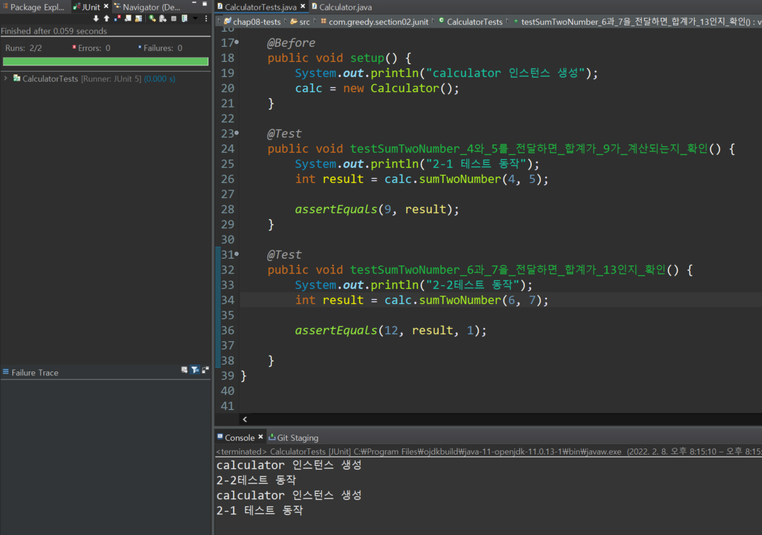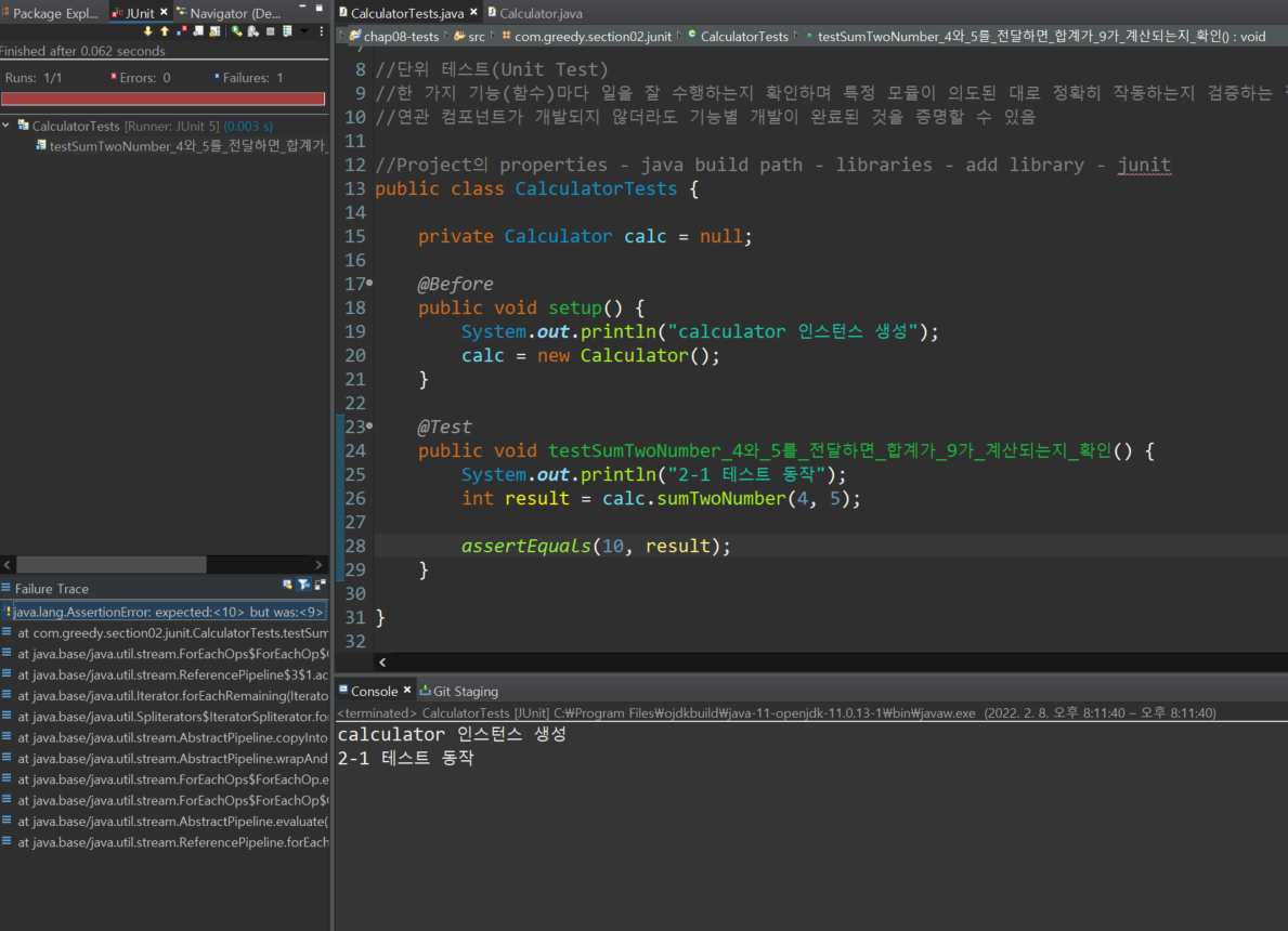 assertEquals에 일부러 답을 틀리게 적으면 에러가 왜 틀렸는지 Failur Trace에 나온다.