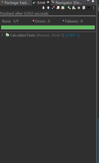 이후에 실행을 해주면 JUnit창이 새로 뜨고 문제가 없다면 메소드 수행결과가 잘 됐는지 결과가 나온다.