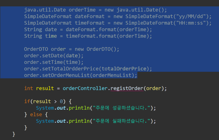 마찬가지로 registOrder메소드도 OrderController로 바꿔주는데 위에 드래그한 값들은 데이터에 대한 가공처리를 한 부분은 제거해주고, 리턴값에 대한 if문도 지워준다.