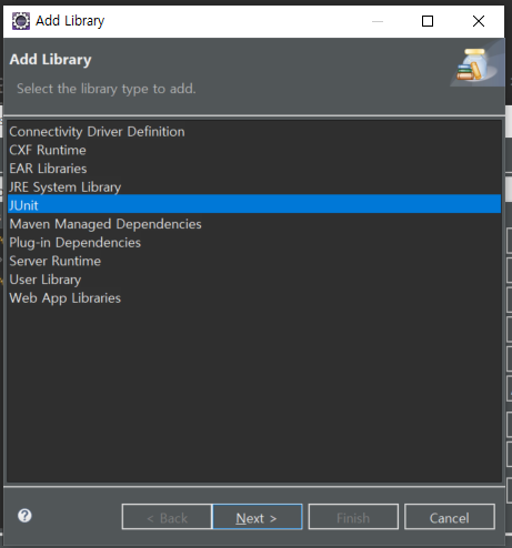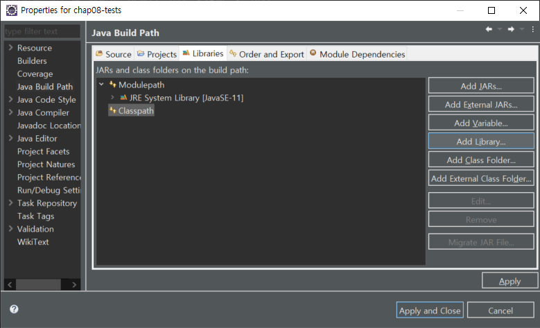 해당 클래스 Properties-java build path-Libraries에서 Add Library를 선택해준다.
