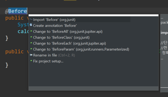 이후 다시 와서 @Before org.junit을 import할 수 있다.