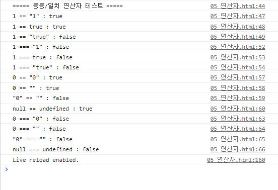 console.log("===== 동등/일치 연산자 테스트 =====");
