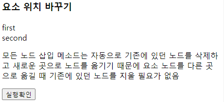 모든 노드 삽입 메소드는 자동으로 기존에 있던 노드를 삭제하고 새로운 곳으로 노드를 옮기기 때문에 요소 노드를 다른 곳으로 옮길 때 기존에 있던 노드를 지울 필요가 없음