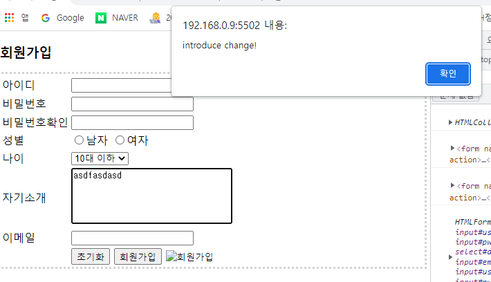 자기소개란에 값 입력 후 마우스포인터가 밖으로 나가면 alert 실행