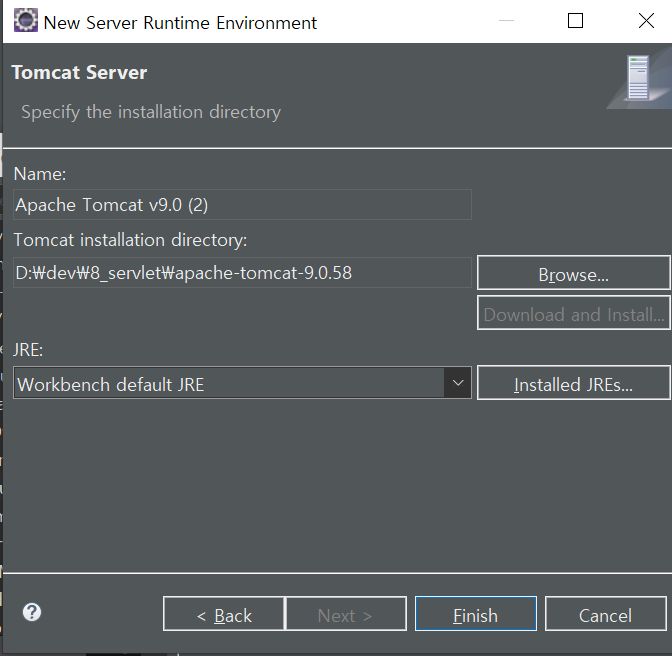 Browse 선택 후 위에서 다운로드한 Tomcat 위치를 설정해준다.