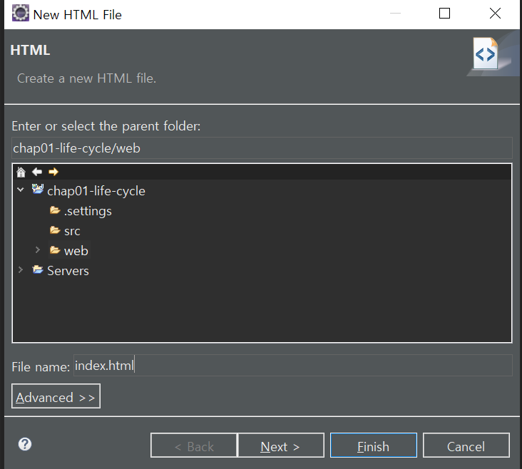 web폴더 밑에 HTML 파일을 생성해준다. 이름은 index.html