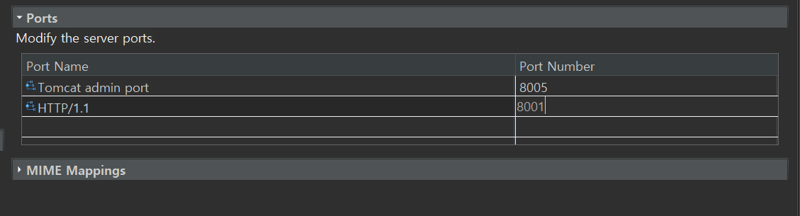 port번호 8080에서 8001로 수정해준다. (이미 사용하고있는 포트번호이니 다른 포트번호로 설정)
