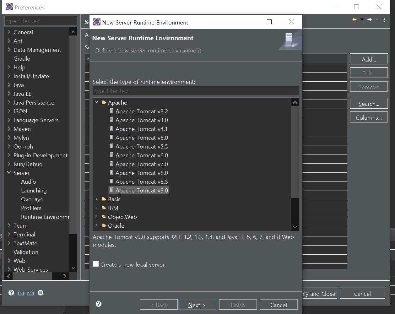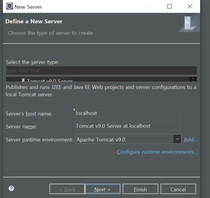 Server-Runtime Environment 선택 후 Apache Tomcat v9.0선택 후 next