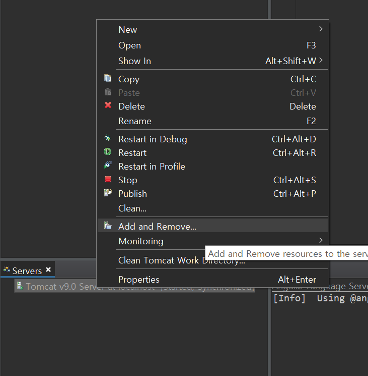 지금 작성 중인 프로젝트가 서버 위에 올라갈 수 있도록 설정해준다. 서버 우클릭해서 Add and Remove 클릭