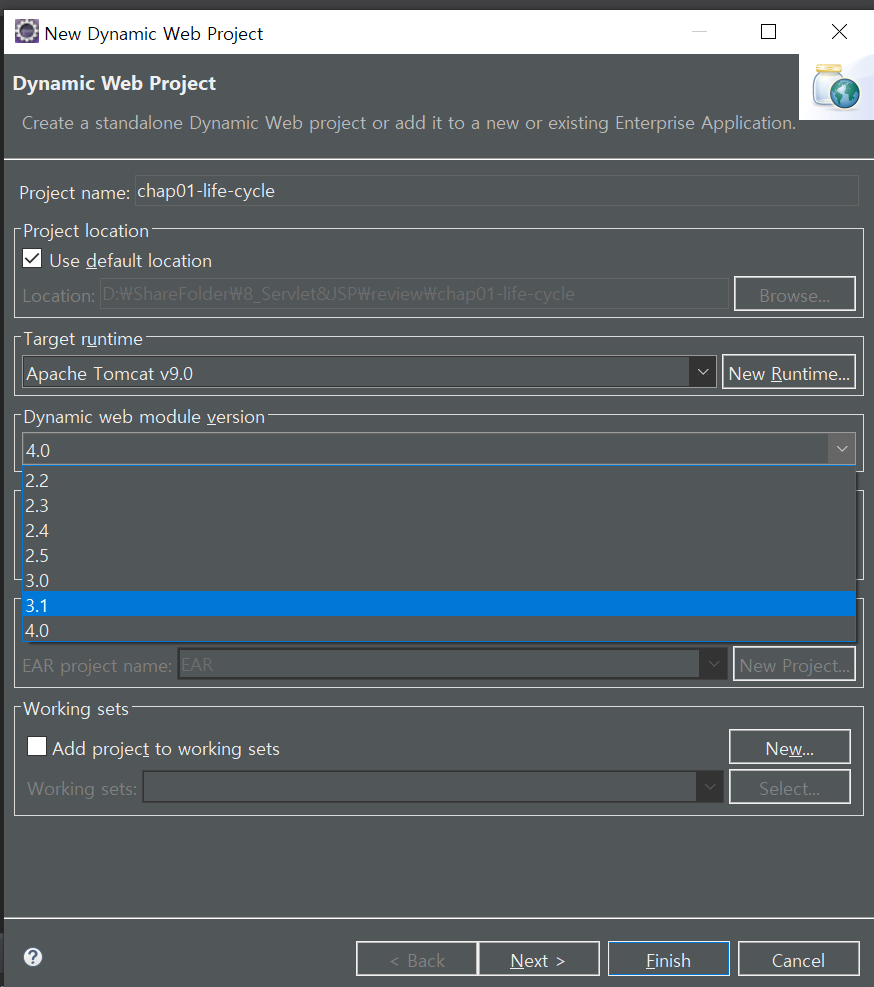 Dynamic Web Project를 만들어보자. 웹 모듈 버전은 3.1로 선택 후 Next 클릭