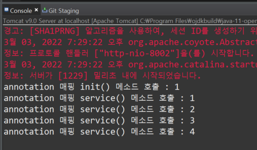 System.out.println("annotation 매핑 service() 메소드 호출 : " + serviceCount++);