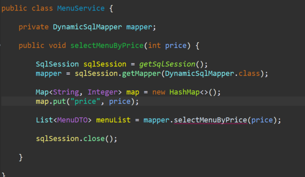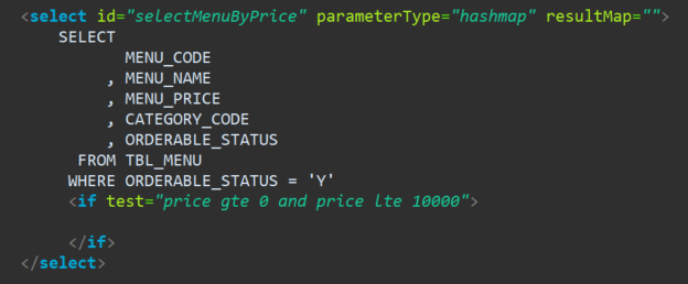 <select id="selectMenuByPrice" parameterType="hashmap" resultMap="menuResultMap">