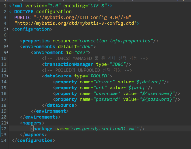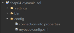 connection-info.properties 파일을 생성하고 mybatis-config.xml파일을 기존에 있던 것을 복사해온다.