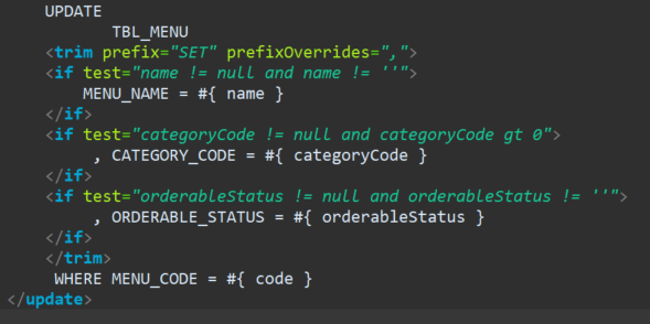 - suffixOverrides : 처리 후 엘리먼트 내용 중 가장 뒤에 해당 문자들이 있다면 자동으로 지워준다.