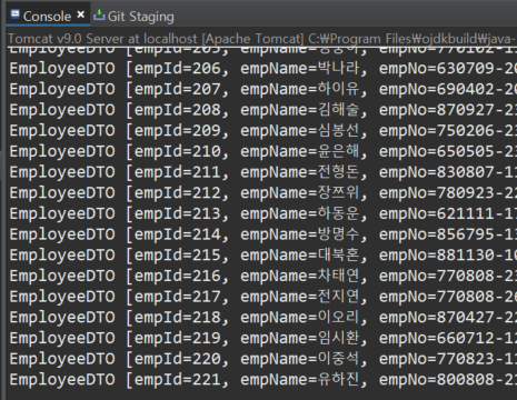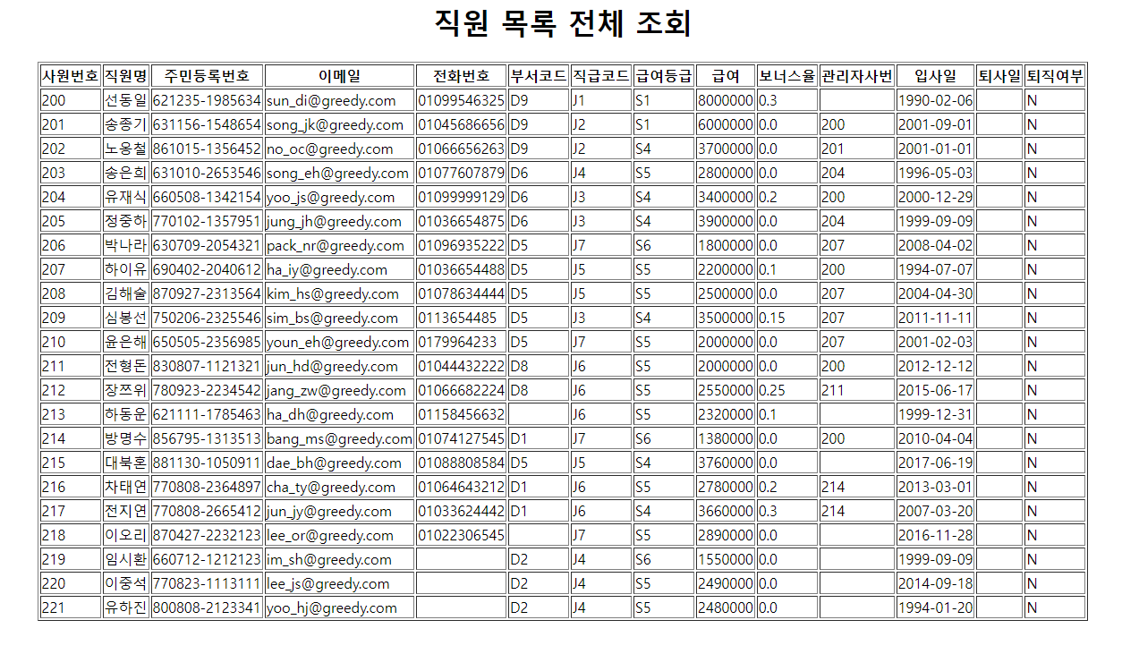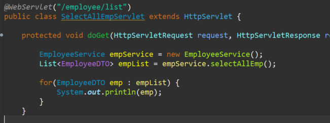 주소창을 확인해보면 employee/list 서블릿 매핑된 것 잘 확인되고, 출력문에서도 전체 직원이 조회된다.