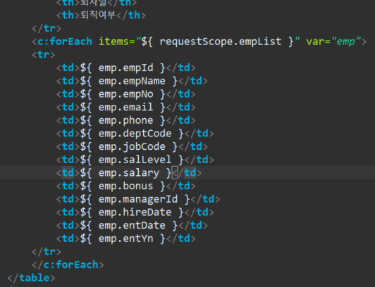 단, 반복적으로 출력하기 위해 jstl의 core라이브러리가 가지고 있는 foreach기능을 사용한다.