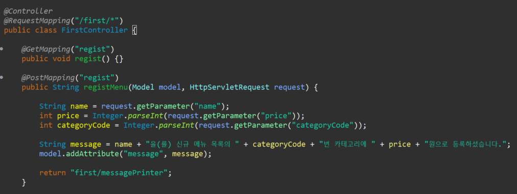 GET 방식의 /first/regist 요청이 들어오면 /first/regist 뷰로 위임한다.