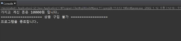 - 예외 발생 구문 이하 구문은 동작하지 않고 되돌아온다. (상품가격 50000, 가진 돈 10000 코드 이하구문)
