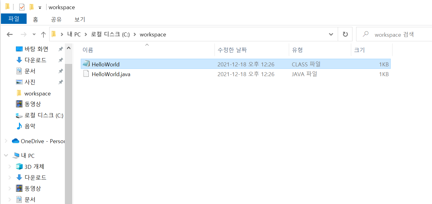 - cmd창에선 변화가 없지만 workspace 폴더로 가보면 class파일이 생김.