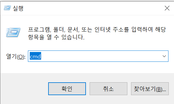 - 윈도우키 + R 누르고 실행창에서 cmd 엔터