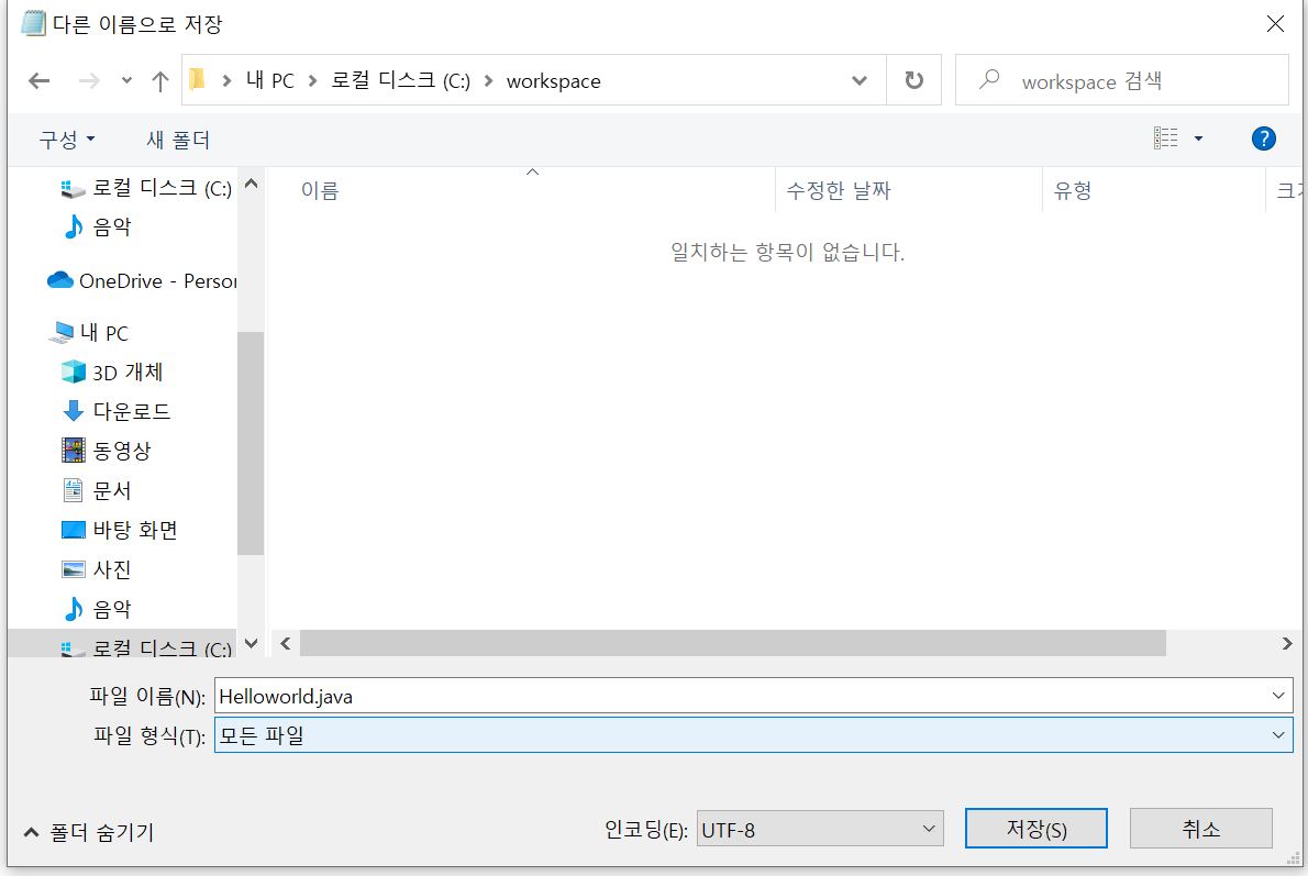 - 메모장을 켠 뒤 Helloworld.java 다른이름으로 workspace에 저장 (파일형식은 모든 파일)