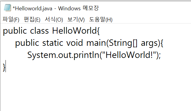 - Helloworld.java 메모장에서 오타없이 대소문자 반드시 구분해서 쓰기